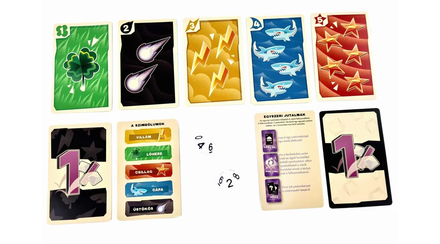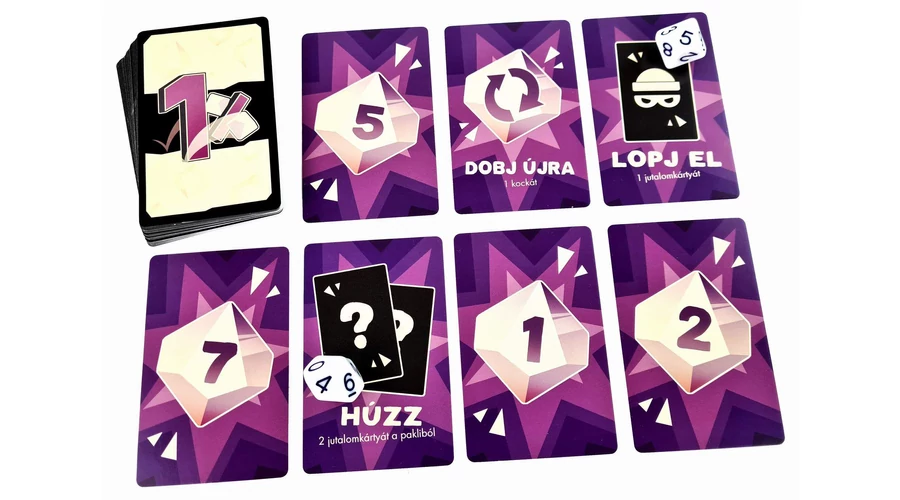 Hogy mekkora esélye? Természetesen 1%! Ugyanis két 10 oldalú kockával („d10”, hogy egy kis szakzsargont is idecsempésszek) kellene 00-t dobnia. Persze dönthet úgy is, hogy dobás helyett inkább szerez egy kártyát, amivel a nyerési esélyeit növelheti. Pl. egy 9-es kártyát, amit maga elé vesz, innentől nem csak a 0, de a 9 is nyerő szám lesz számára. Amint a játékos választott három jutalmat (ami lehet dobás vagy kártyaszerzés), új forduló következik, és mindezt addig folytatjátok, amíg valaki olyat nem dob, amivel megnyeri a játékot!