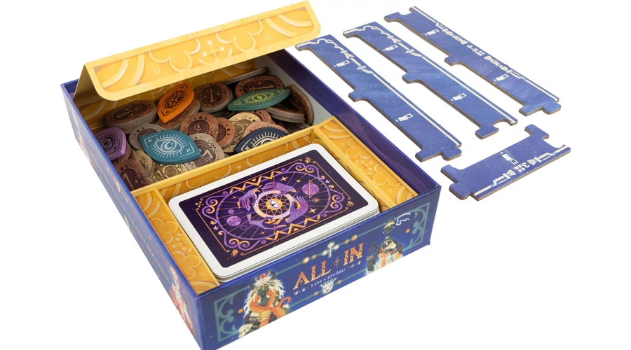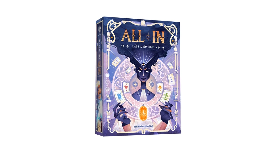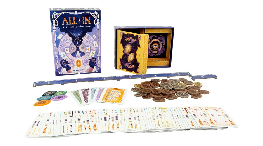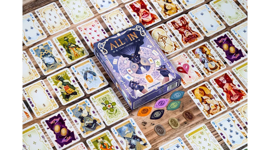 Az All in – Láss a jövőbe! egy pörgős, taktikus kártyajáték 2–5 játékosnak, amely a póker alapjaira épít, de egy különleges csavarral egészíti ki azt: nemcsak erős kombinációkat építesz, hanem meg is jósolod, kié lesz a legerősebb kéz.