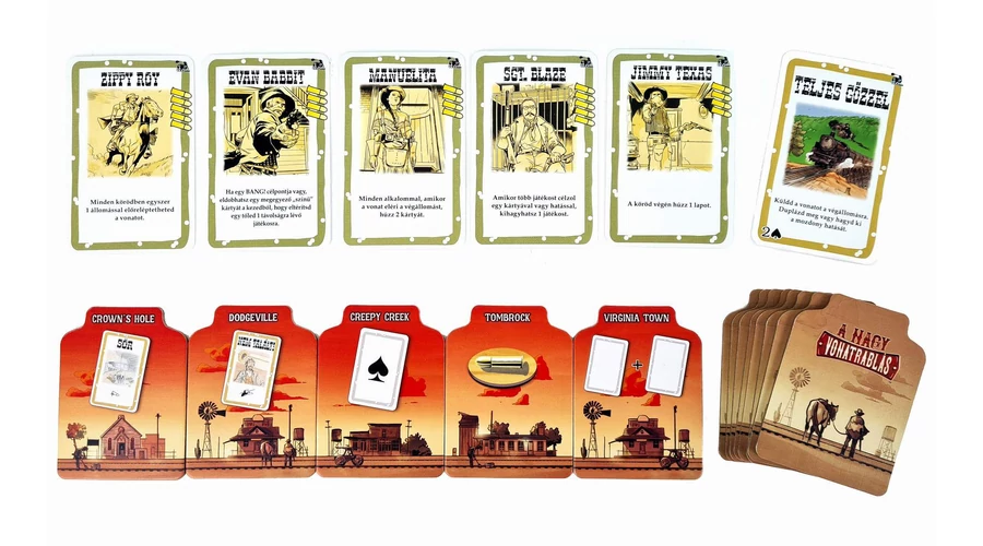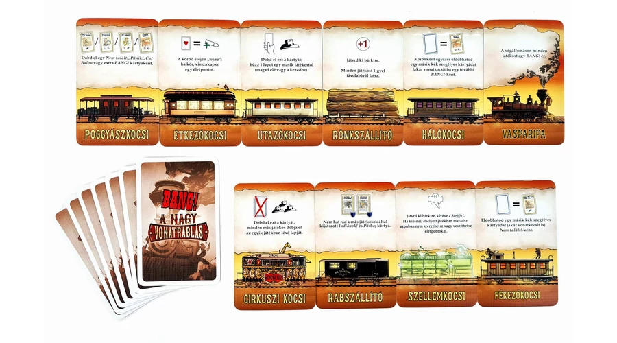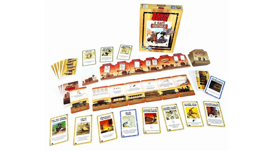 A Bang! A nagy vonatrablás a népszerű, titkos szerepes partijáték kiegészítője, ami új karaktereket és mechanizmust hoz a játékba: vonatot rabolhatunk, hogy az ott szerzett zsákmányokat felhasználhassuk egymás ellen...