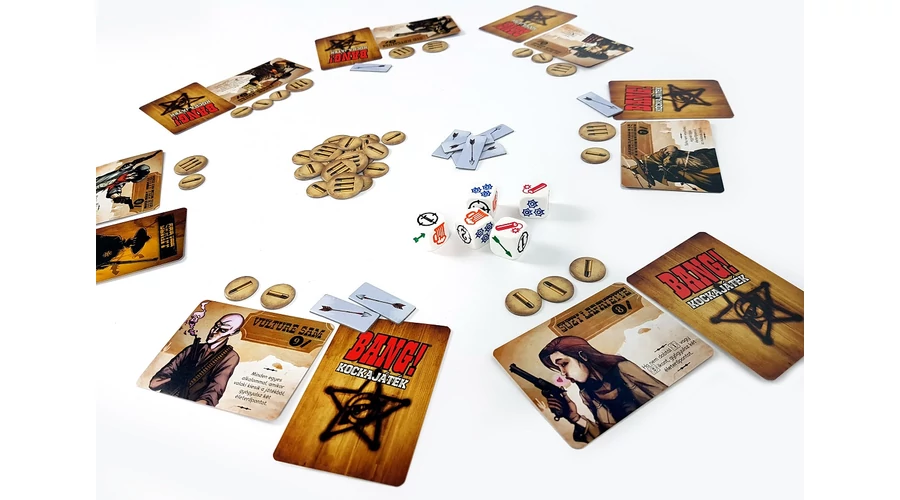A Bang! Kockajáték népszerű, titkos szerepes partijáték. Ebben a társasjátékban a játékosok a vadnyugat hőseinek és banditáinak bőrébe bújnak, és a kockák gurításával igyekeznek leszámolni ellenségeikkel. A játékhoz több kiegészítő is kapható, amelyek még érdekesebbé teszik a játékmenetet!