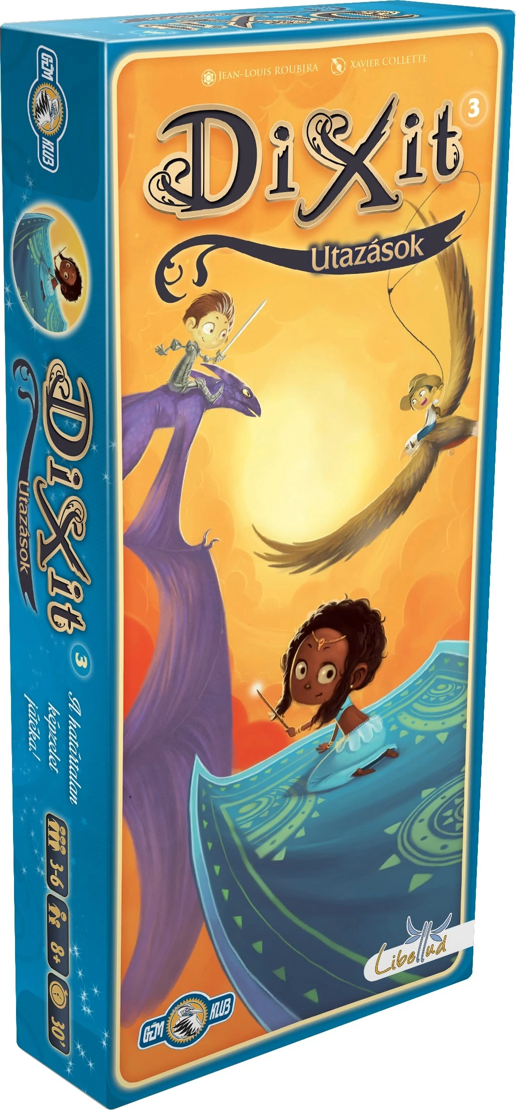 A Dixit kiegészítője: 84 gyönyörű, új kártyával utazhatunk a fantázia világába. A Dixit 3 – Utazás segítségével a népszerű, Év játéka díjas asszociációs társasjátékot új festményekkel bővíthetjük. A játékhoz szükség van a Dixit vagy a Dixit Odyssey alapdobozra!