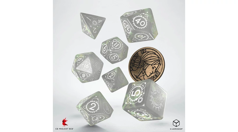 A Witcherből ismert karakter jegyeit magán hordozó, 7 dobókockából és egy fém érméből álló szett.