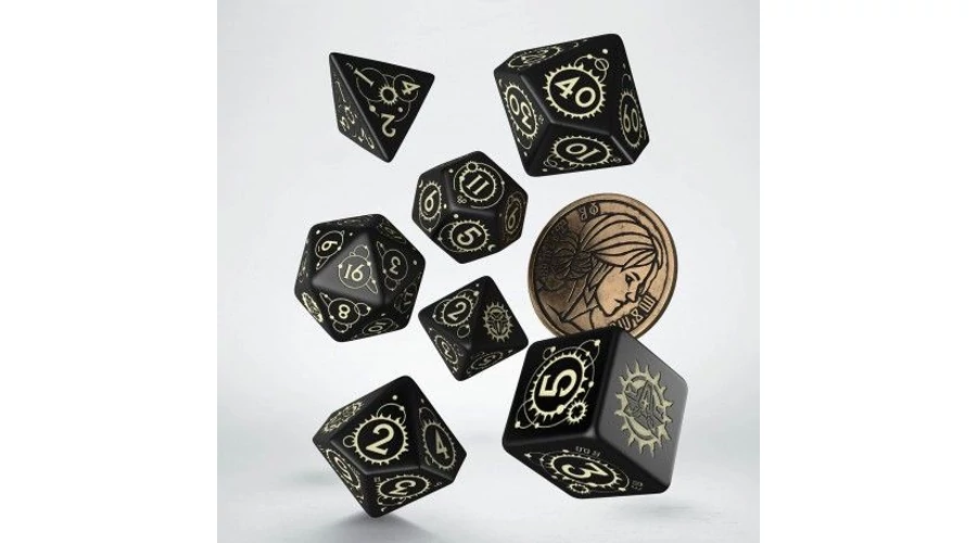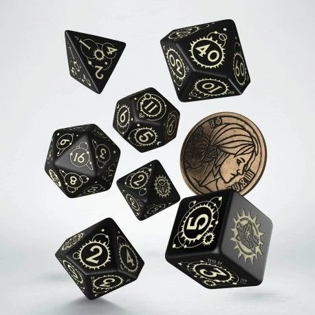 A Witcherből ismert karakter jegyeit magán hordozó, 7 dobókockából és egy fém érméből álló szett.