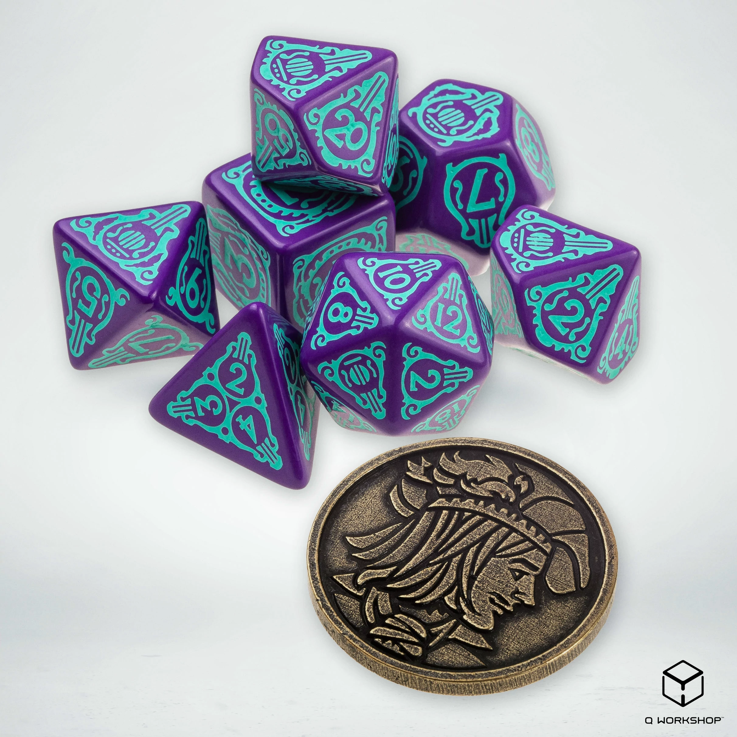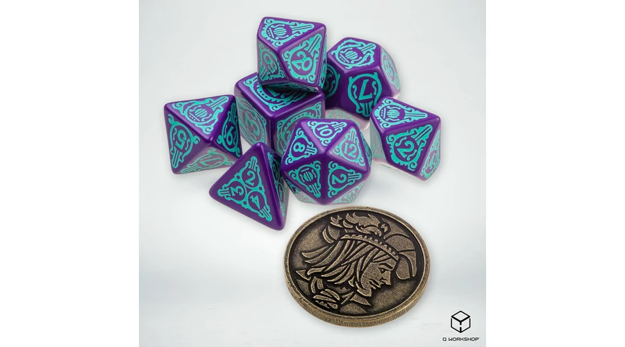 A Witcherből ismert karakter jegyeit magán hordozó, 7 dobókockából és egy fém érméből álló szett.