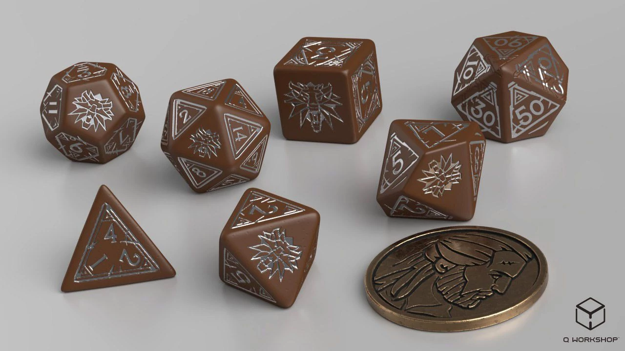 A Witcherből ismert karakter jegyeit magán hordozó, 7 dobókockából és egy fém érméből álló szett.