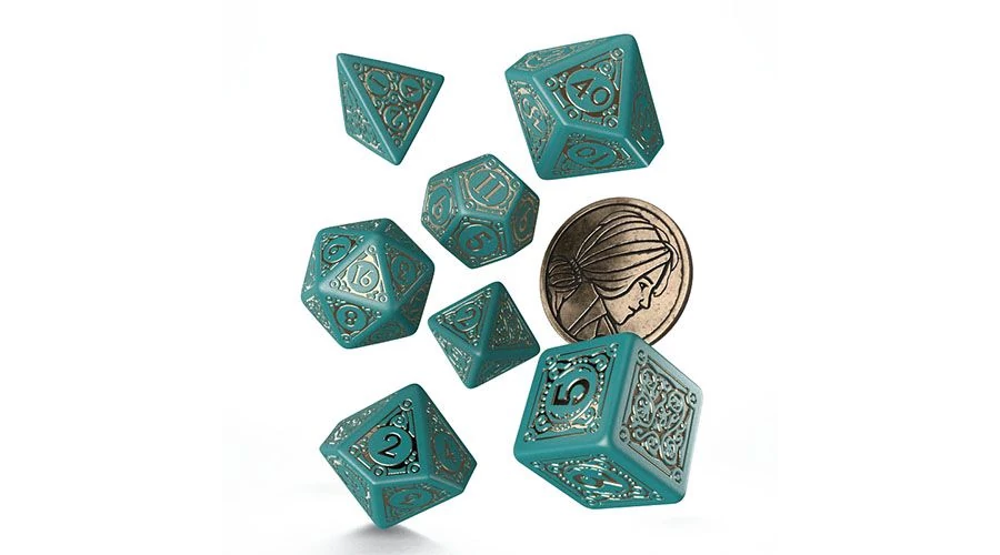 A Witcherből ismert karakter jegyeit magán hordozó, 7 dobókockából és egy fém érméből álló szett.