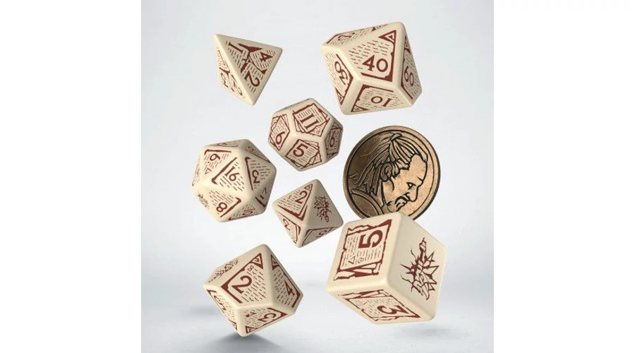 A Witcherből ismert karakter jegyeit magán hordozó, 7 dobókockából és egy fém érméből álló szett.