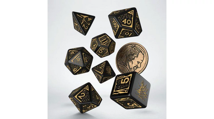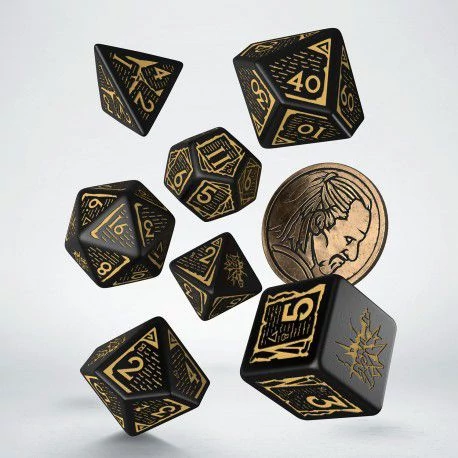 A Witcherből ismert karakter jegyeit magán hordozó, 7 dobókockából és egy fém érméből álló szett.