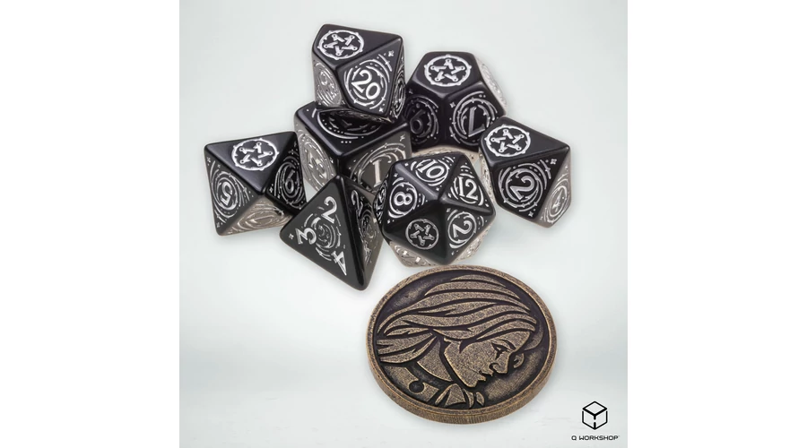 A Witcherből ismert karakter jegyeit magán hordozó, 7 dobókockából és egy fém érméből álló szett.