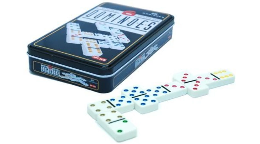 Dominó készlet, dupla 6-os, színes pöttyökkel, fém dobozban -695101