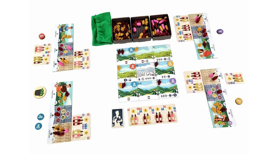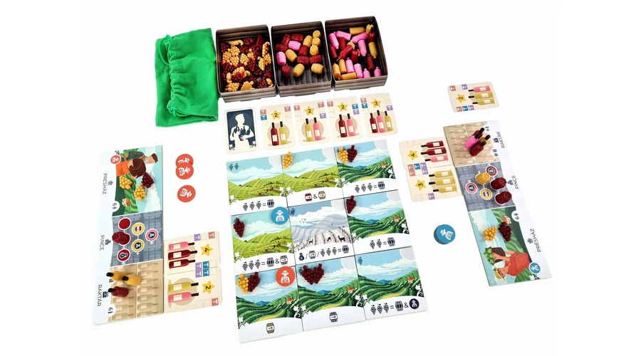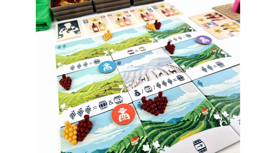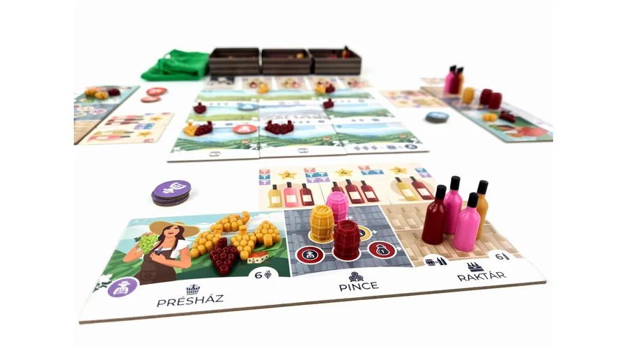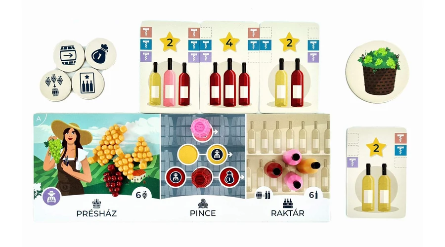A dűlők, amik a játék központi elemét alkotólapkák, nem csak azért fontosak, mert ezekre helyezzük és innen szerezzükaszőlőjelzőket, hanem a játékban végrehajthatóakciókat is ezekkel a lapkákkal aktiváljuk. A szőlőből ugyanis nem lesz csak úgy, zokszónélkül győzelmi pont, és ezt minden igazi borász tudja. A dűlőről a szőlőegyenesen a présházba kerül, onnan pedig a pincébe, de ekkor már hordóban. Itt aztán érlelődik egy darabig, aztán lehet palackozni: az impozáns szőlőfürtöket előbb apróhordók, majdcsinos kis borosüvegek váltják fel. Ezekkel már lehet is teljesíteni a rendeléseket, kinek két vörös és egy rozé, kinek egy fehér, egy vörös, az a fő, hogy győzelmi pont lesz belőle!