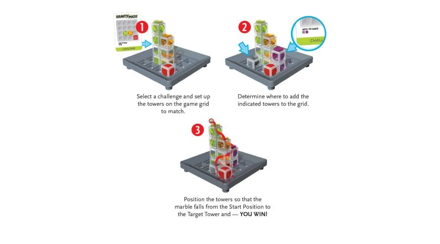 Be ne golyózz! A Gravity Maze egyszemélyes feladatmegoldó játék. A játékosnak 60, egyre nehezülő pályán kell úgy felépíteni a tornyokat, hogy a golyót célba juttassa. A logikai képességeket fejlesztő társasjáték.
