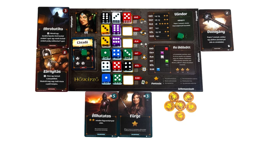 A Hősképző különleges stratégiai társasjáték, amelyben a játékosok nem csatákat vívnak vagy kincseket keresnek, hanem a legizgalmasabb kaland első lépését teszik meg: megalkotják hősüket! A játékosok kockadobásokkal és ügyes döntésekkel alakítják ki hősük tulajdonságait: erejét, ügyességét, bölcsességét vagy karizmáját. A választott faj, kaszt, jellemvonások és háttértörténet mind hozzáad egy-egy darabot a készülő karakter mozaikjához. Vásárolhatsz neki fegyvereket és páncélokat, különleges képességeket sajátíthatsz el, titkos célokat teljesíthetsz.