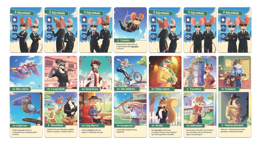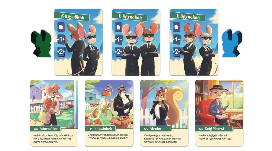 A Kertvárosi kémek: Egerek a szomszédban kiegészítő új figurákkal, friss kártyákkal és egy teljesen új üldözésmechanikával borzolja tovább a kertvárosi kémjátszmákat. Az E-ügynökök megérkezésével a verseny még feszültebbé, kiszámíthatatlanabbá és izgalmasabbá válik.