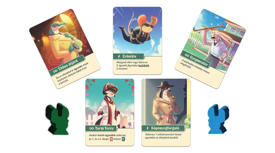 Mindkét játékos kap egy E-ügynök figurát, amelyet a toborzás során aktiválhat. Az új ügynökkártyák segítségével mozgathatjátok ezeket a figurákat előre vagy hátra a játéktáblán, miközben továbbra is építitek a saját ügynökhálózatotokat. A cél nemcsak az ellenfél figurájának megelőzése, hanem az is, hogy az E-ügynököt pontosan ugyanarra a mezőre juttassátok – ez ugyanis azonnali győzelmet jelenthet.