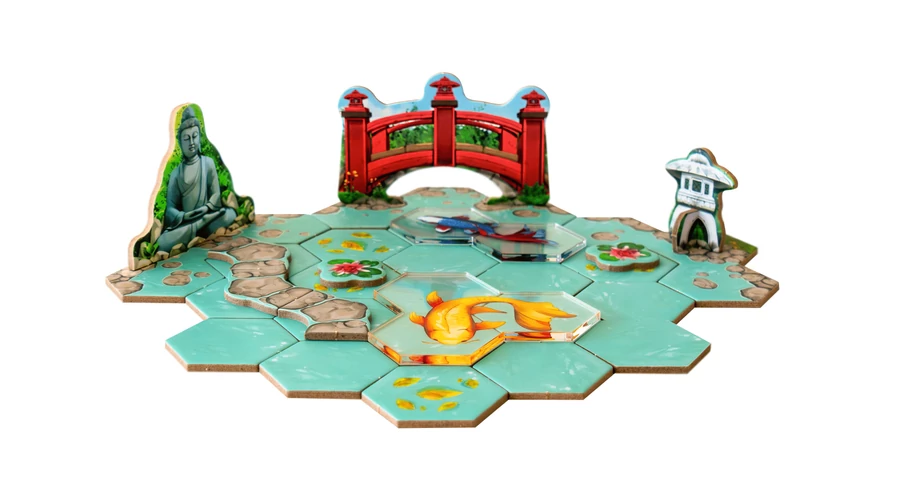 A Koi társasjátékban a japán esztétika letisztult világa elevenedik meg az asztalon. A koi ponty a japán kultúrában a harmónia, a kitartás és a szépség jelképe – ebben a játékban pedig ezek köré építitek fel a saját tavatokat, lépésről lépésre. Kártyák és térbeli elemek segítségével formáljátok a környezetet: hidak, kőlámpások, szobrok és tavirózsák kerülnek a víz köré, miközben színes, áttetsző akril lapkákon jelennek meg a benne úszó koi-k. Az elemek nemcsak funkcionálisak, hanem folyamatosan alakítják a játék képét is – minden elkészült tó egyedi megjelenésű.