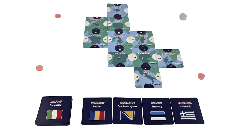 A játékban egy különös térképet építetek: a földrész darabokra hullott, a városok összekeveredtek, és rajtatok múlik, hogy újra értelmes rendbe kerüljenek. Minden körben választotok városkártyákat a kínálatból, majd megpróbáljátok őket a megfelelő helyre illeszteni az észak–dél és kelet–nyugat irányok alapján.A feladat elsőre egyszerűnek tűnik, de gyorsan kiderül, mennyire könnyű mellélőni. A kártyákat nemcsak üres helyre tehetitek le: akár egy már lerakott lap helyére is becsúsztathatjátok őket, ilyenkor viszont az egész sor vagy oszlop elmozdul. Egyetlen döntés az egész térképet átrendezheti.