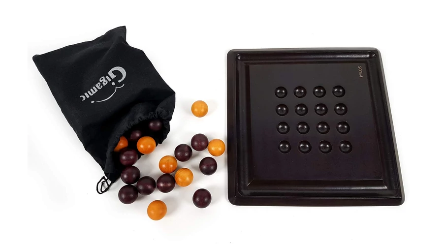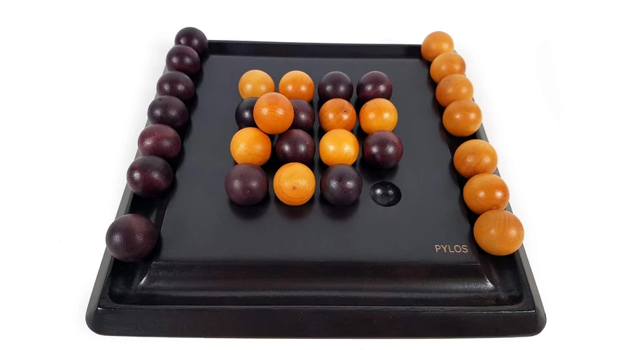 Tedd fel a piramis csúcsát! A Pylos letisztult, klasszikus logikai társasjáték. A játékosok felváltva tesznek fel egy golyót a piramisra, de akinek sikerül egy négyes csoportot alkotnia, levehet egy vagy két golyót...