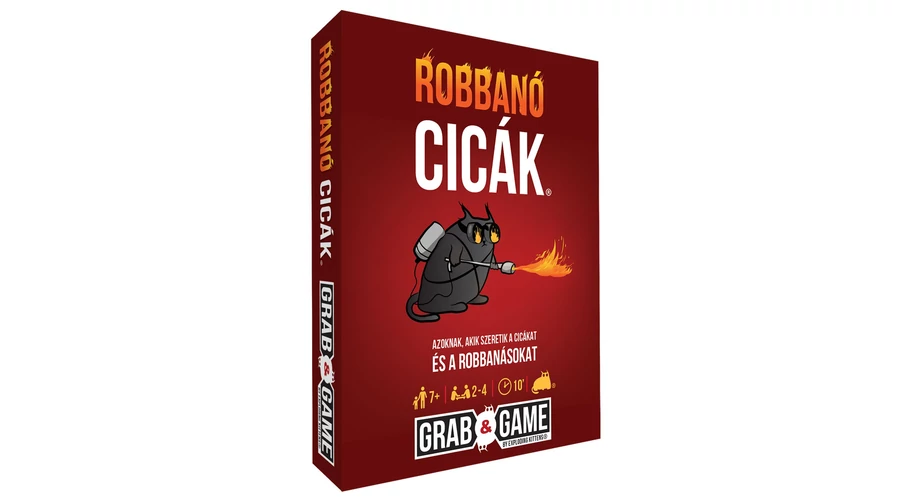 A Robbanó cicák Grab&Game a nagysikerű, frenetikus partijáték, a Robbanó cicák zsebrevágható, úti kivitele, amellyel legfeljebb 4 fős társaságok, családok játszhatnak. A morbid grafikával illusztrált lapok közül a játékosok saját körükben akármennyi lapot kijátszhatnak, hogy társaiktól vagy a dobópakliból lapot húzzanak, megnézhessék a húzópakli legfelső lapjait, vagy akár újra is keverhessék azt, csak hogy elkerüljék a veszélyes házi kedvencek kezükben történő felrobbanását – és így a kiesést!