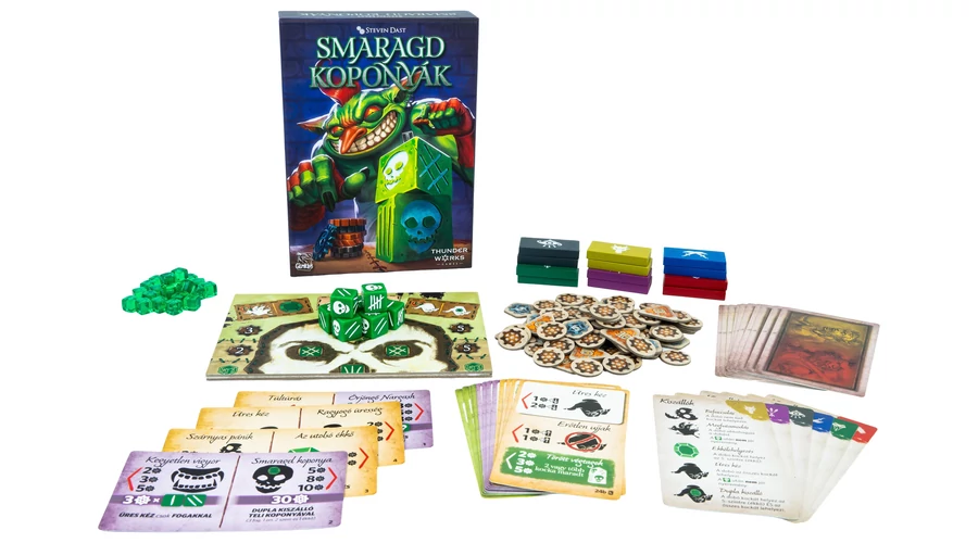 A Smaragd koponyák izgalmas szerencsejáték, amelyben a játékosok felváltva töltik be a „kockáztató” szerepét, aki igyekszik minél több kockát lehelyezni az öt szintből álló koponyatáblára. A szabály egyszerű, de kegyetlen: csak a kockáknak megfelelő értékű szinten töltheted fel a táblát, és csak a már korábban lerakott kockák szintjére, vagy azok fölé. Eközben a többi játékos gyors fogadásokat köt a „kockáztató” játékos dobásainak eredményére – minél hamarabb teszik meg a tétet, annál nagyobb a nyereményük. A játék addig tart, amíg a fogaskerekek készlete el nem fogy. A győztes pedig az lesz, aki a legtöbbet gyűjti össze belőlük!