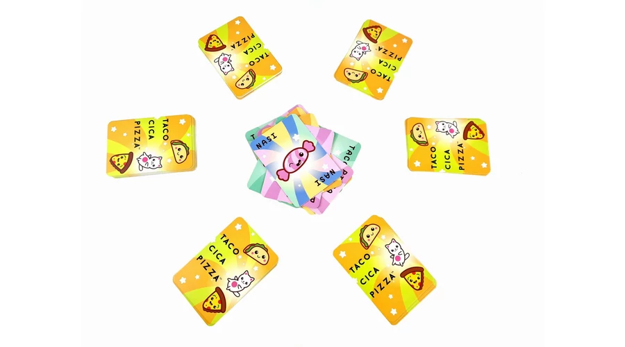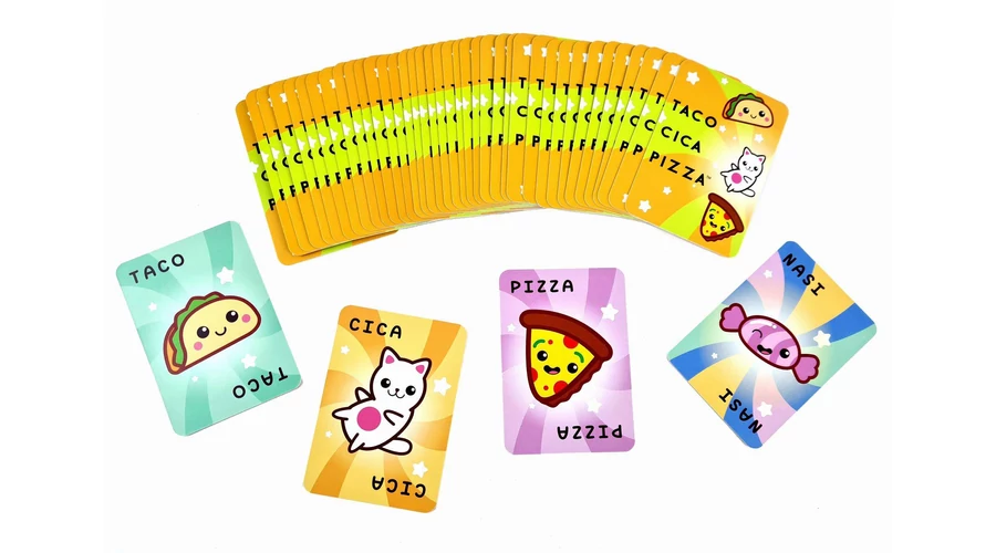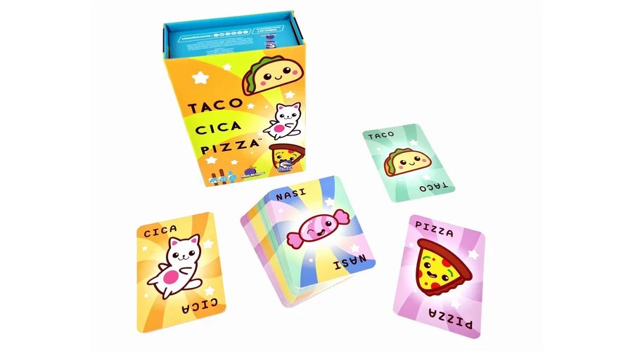 A Taco Cica Pizza pörgős és vicces társasjáték gyerekeknek – a nagy sikerű partijáték kicsiknek készült változata. A játékosok megtippelik, milyen kártyájuk következik – de ha nasit látnak, le kell csapniuk rá!