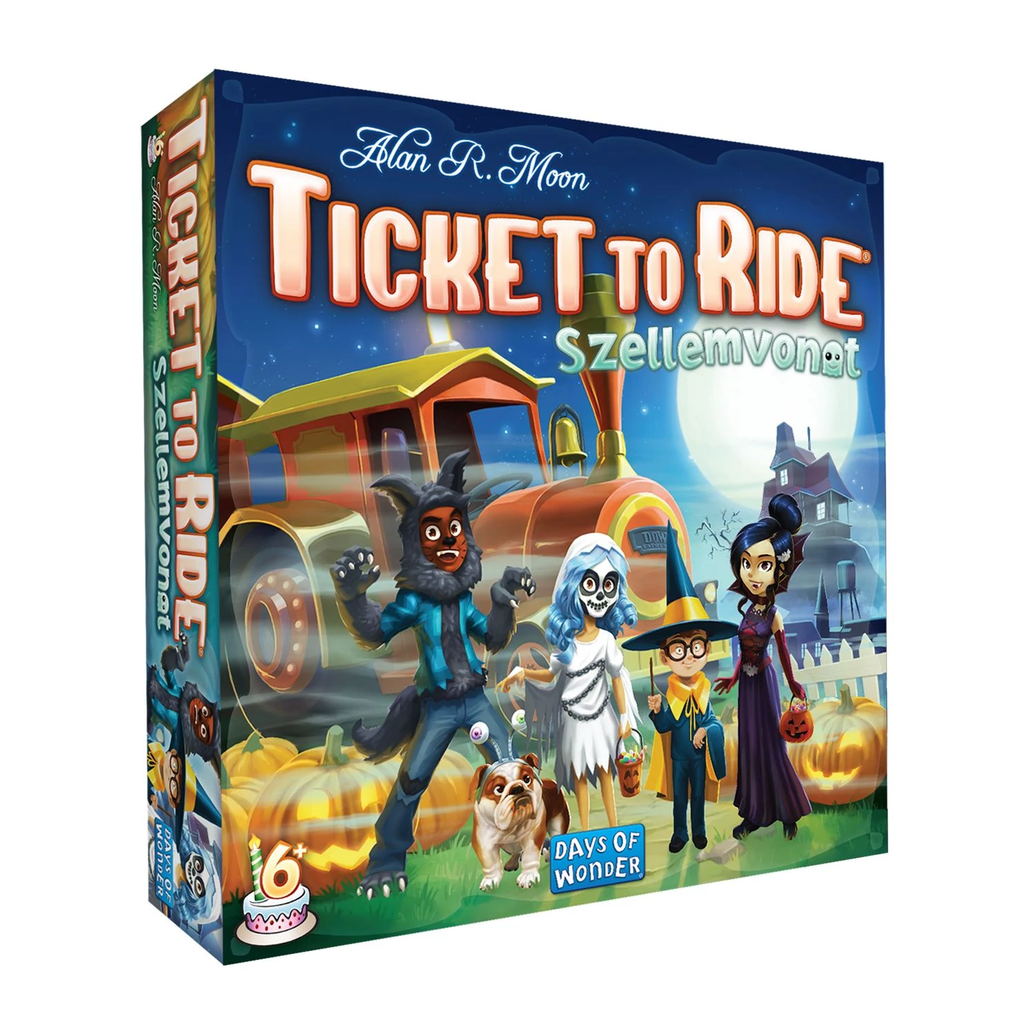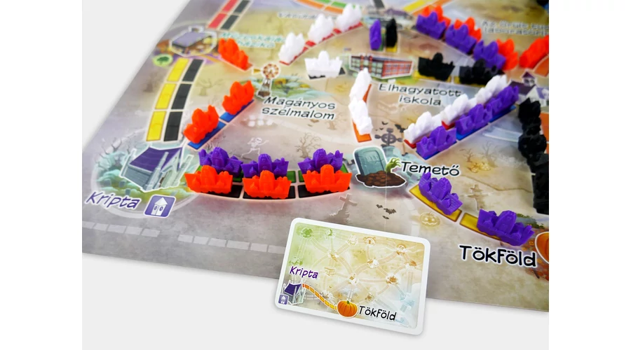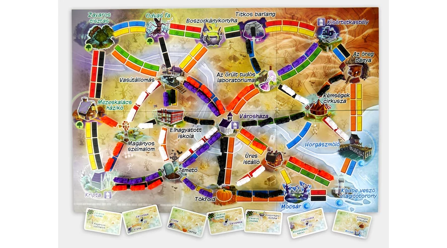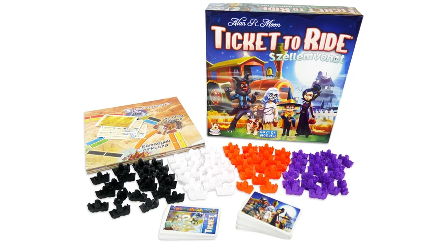 Gyűjtsd a kísértetkocsi-kártyákat, köss össze rejtélyes helyszíneket, és siess, mielőtt az utak örökre eltűnnek a homályban! A klasszikus Ticket to Ride játék gyermekbarát változatában könnyedén elsajátíthatod a vonathálózatok építésének fortélyait, miközben felfedezed a térkép kísérteties úti céljait: a Mézeskalács házikót, a Kísértetkastélyt, a Mocsarat és még sok más varázslatos helyet.